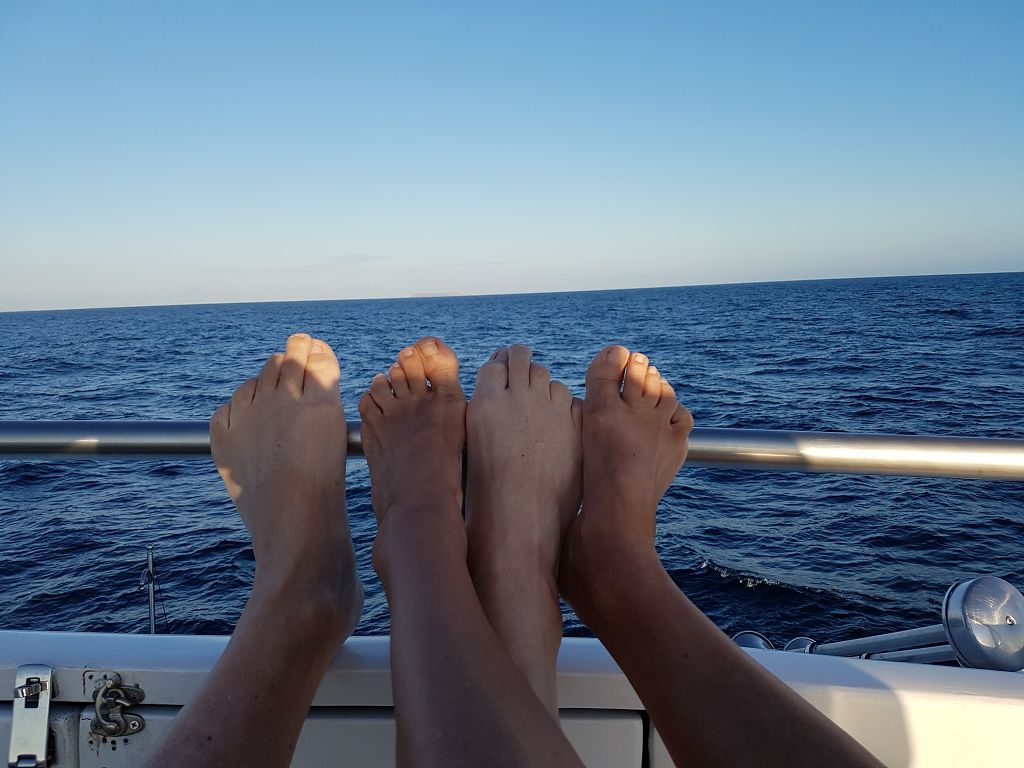 Um zu unserem naechsten Ankerplatz zu gelangen, mueesen wir heute ein langes Stueck an der Insel Isabella entlangfahren und da auf der Westseite nun der offene Pazifik wartet, moechte man das nicht ueber Nacht machen. Die Wolken wurden duch einen strammen Westwind vertrieben und das Boot schaukelt ganz schoen. So kann jeder seinen Nachmittag individuall verbringen. Wir sind die meiste Zeit oben an Deck und bewundern die Aussicht. Irgenwann sehen wir tatsaechlich auch 2 Wahle, warscheinlich waren das Orcas.