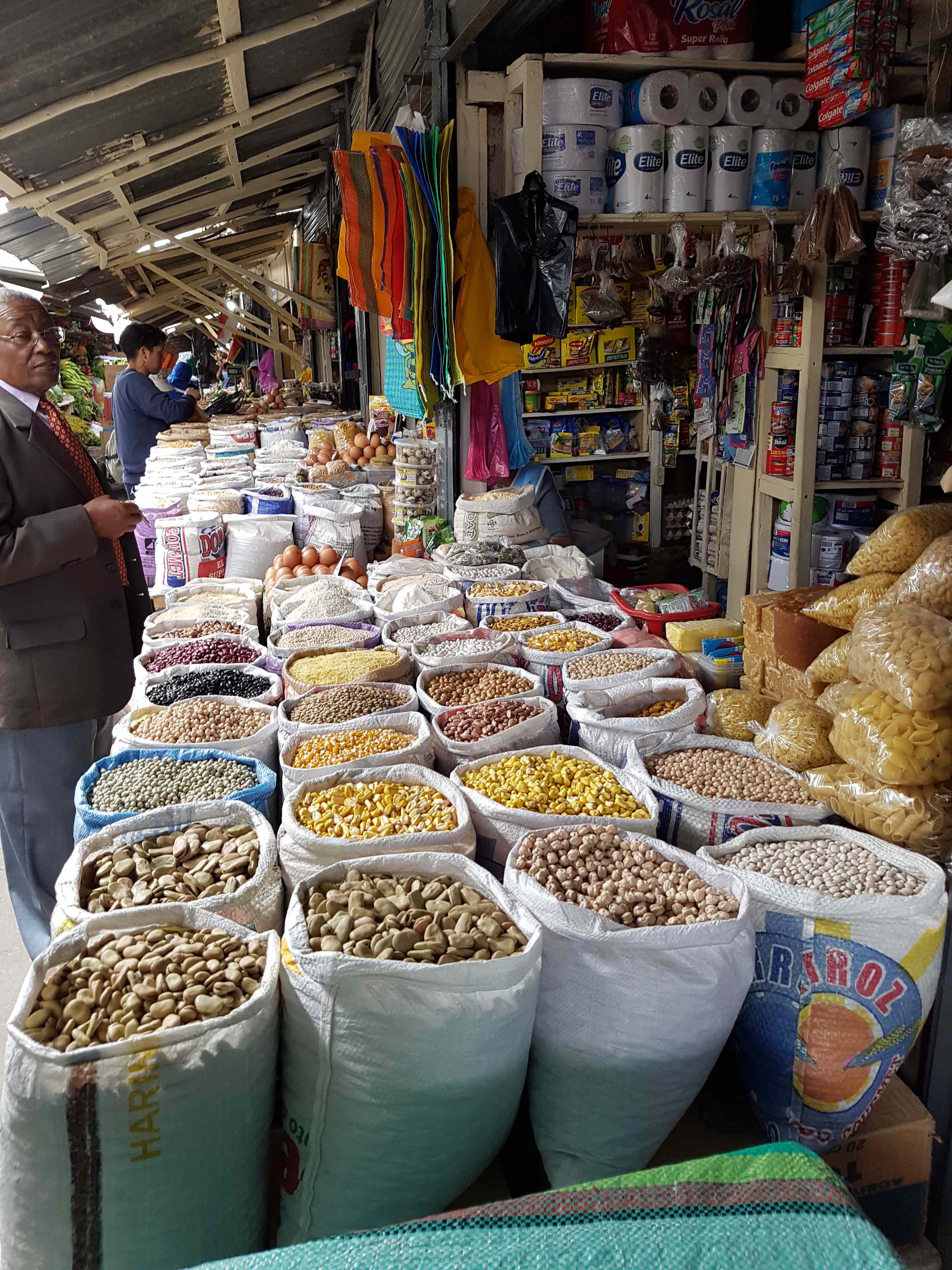 Dann erkunden wir die Innenstadt von Ibarra, die im Stadtkern nach Erdbeben immer wieder im Kolonialstil aufgebaut wurde. Wir verlaufen uns im Maktviertel, was uns fasziniert. Zunaechst startet man in einer Halle, in der der Fleischmarkt ist und der Blumenmarkt. Bei den Floristen entstehen ueberdimensionale Gestecke aus frischen Blumen, die bei uns sofort die Assoziation zu Beerdigungen hervorruft. Spaeter sehen wir diese Getecke in einer der vielen Kirchen als Altarschmuck. Nach der Halle kommen kleine quadratische Laeden, die mindestens an 2 Seiten offen sind mit Schuhen, Kleidung, Wolle und so weiter. Dahinter wurde eine Freiflaeche mit einem undurchdringlichen Gewirr von Marktstaenden zugepflastert. Wir streifen an ueberbordenden Obsttaenden vorbei, aber auch kleine Garkuechen in riesieger Anzahl sind zu finden. Wir kaufen Erdbeeren und Avocados und geroesteten Mais. Uebrigens, der Markt ist fest in den Haenden der Frauen, meist indigener Herkunft.